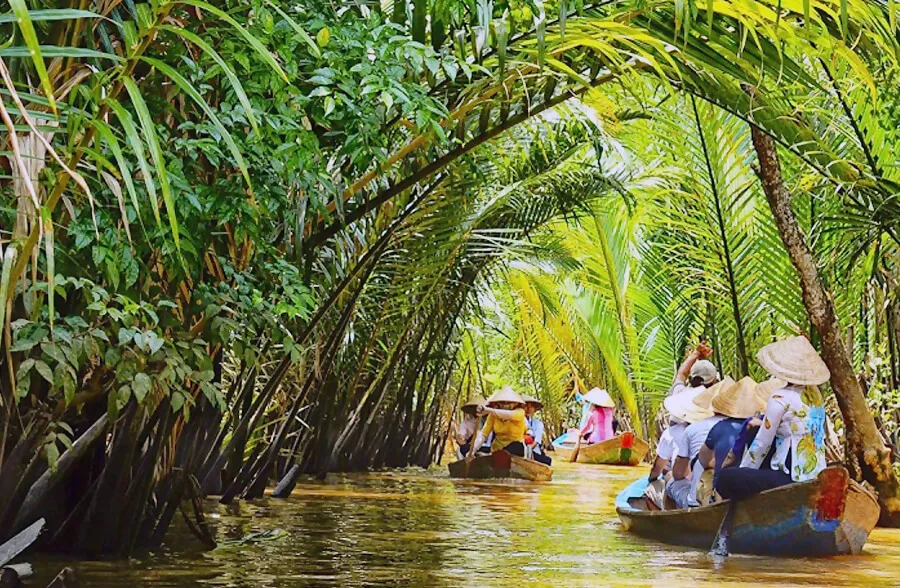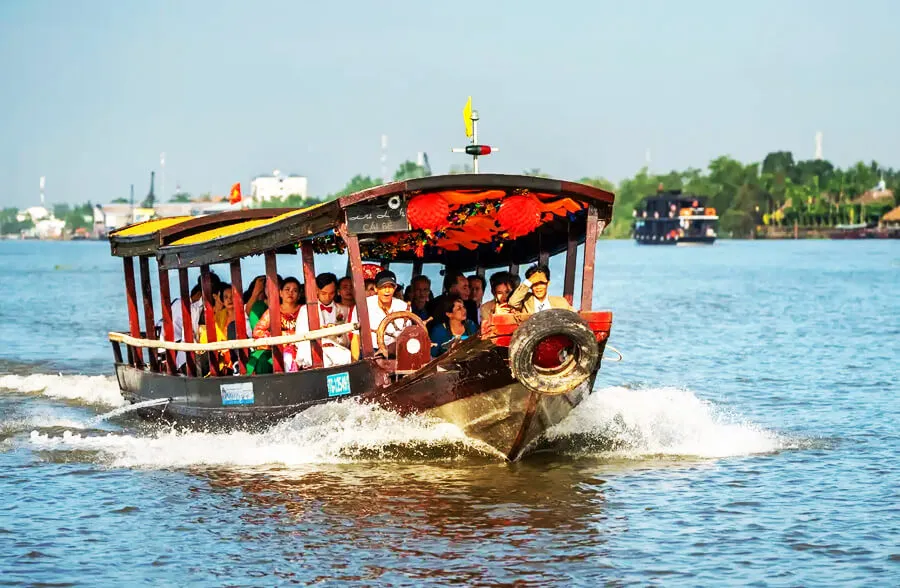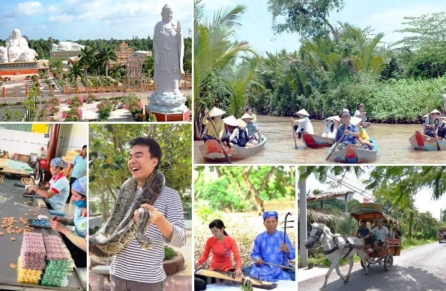 - Trở ra thuyền lớn, xuôi theo dòng sông Tiền, thuyền sẽ đưa quý khách đến tỉnh Bến Tre để tham quan lò kẹo dừa đặc sản của Bến Tre, lò bánh tráng ở xã Tân Thạch. Quý khách được trải nghiệm thú vị khi đi xe ngựa trên đường quê, ngắm cuộc sống thường nhật của người dân địa phương.