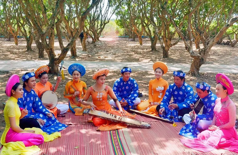 - Tiếp theo Quý khách đến với những giai điệu đờn ca tài tử Xứ Dừa, ăn trái cây miễn phí. Sau đó, du khách dùng xuồng chèo len lỏi vào rạch nhỏ ngắm nhìn hai hàng dừa nước thiên nhiên và phong cảnh đơn sơ của miệt vườn.