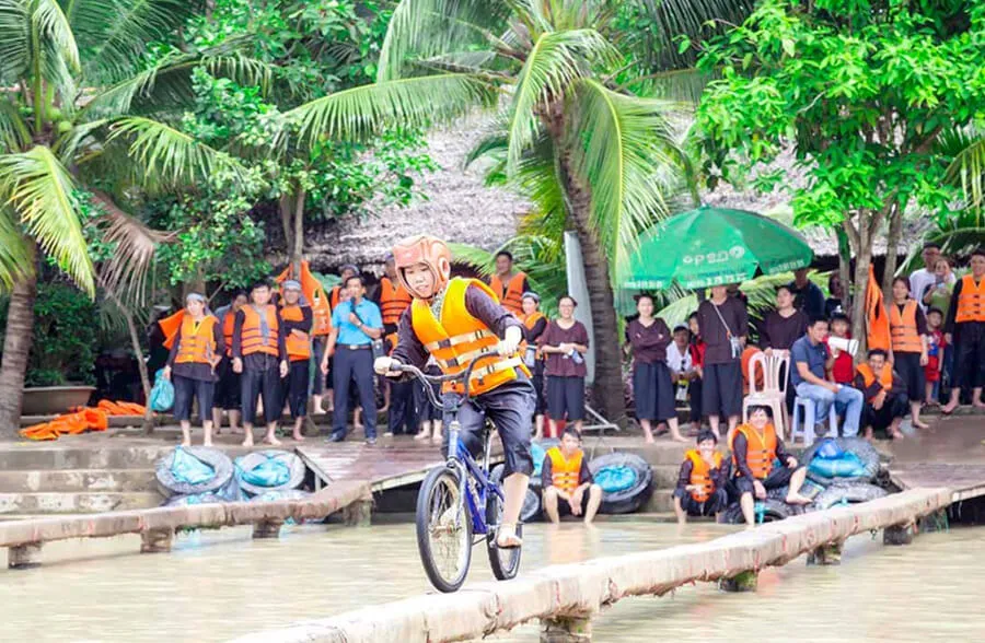 - Tiếp theo đoàn dùng cơm trưa. Tại nhà hàng có trại nuôi cá sấu, nhím, mô hình nuôi ếch, nuôi ba ba... Quý có thể nằm võng nghĩ ngơi hoặc tham quan vườn cây trái, cánh đồng lúa. Đặc biệt tại đây quý khách có thể giam gia chơi các trò chơi hoàn toàn miễn phí như đi xe đạp qua cầu gỗ, chèo thuyền tại rạch nước, đu dây, đi bộ cầu khỉ và nhiều trò chơi hấp dẫn mới lạ.